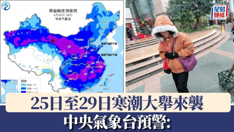 中央氣象台表示,25日至29日寒潮大舉來襲,將自西向東影響除青藏高原外的大部分地區,其中:25日至26日主要影響西北地區、華北西部,27日至29日將影響中東部大部地區。此次寒潮影響範圍廣、降溫劇烈,北方將出現大範圍大風沙塵天氣,淮河以南局部地區將出現強對流天氣,但雨雪強度明顯弱於今年3月1日至3日寒潮過程。