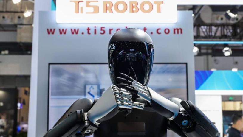 小朋友在第五屆消博會現場體驗機器狗玩具。新華社