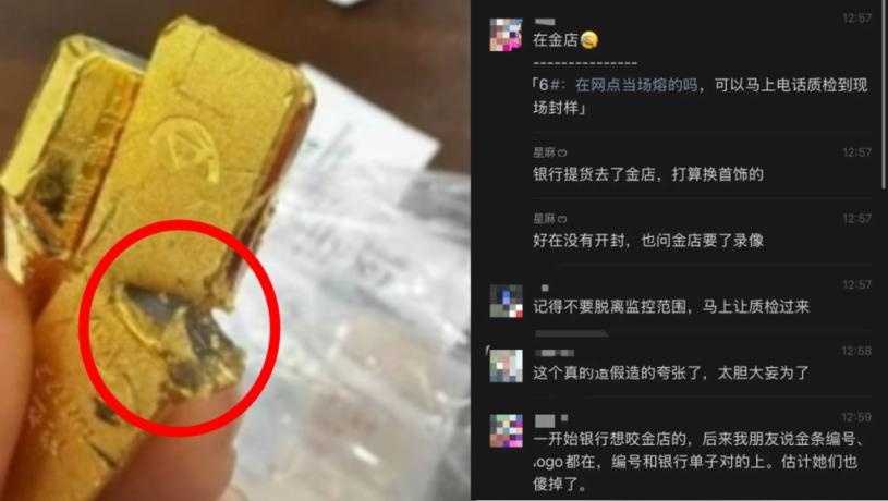 內地《華商報》「大風新聞」報道,網傳聊天記錄顯示,網民在某微信群內稱,「親們,我朋友在銀行買的金條,熔出來是這樣的,網點態度強硬。」附上圖片中,兩條金條,其中一根鑄有“**銀行”等字樣,金條從中間剪開,內部疑似有雜質。群友質疑道,「賣假金條?」「裡面黑黑的是甚麼?不是純金?」