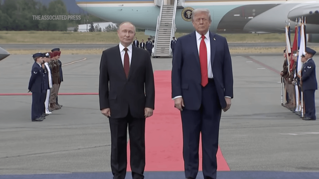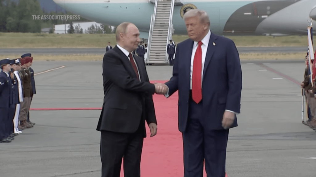 【03:10】特朗普在機場設儀式,迎接普京到訪及會面,期間二人微笑握手,有說有笑,特朗普更一度以雙手蓋覆普京右手,表現親切。之後二人一起踱步至預先準備好的佈景台,供記者拍照。