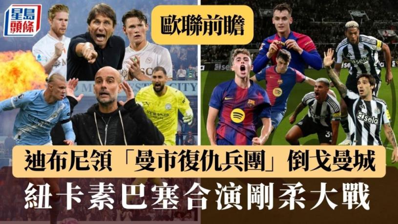 歐聯聯賽階段首輪最後6場賽事,今晚分2個時段上演,兩大班霸曼城和巴塞隆拿同樣在深夜3時出場。藍月坐鎮主場鬥拿玻里,主攻型的哥迪奧拿與務實派的干地如何扭盡六壬,已值得細琢,加上倒戈的奇雲迪布尼帶領「曼市復仇兵團」重回曼徹斯特,令比賽更具話題;而巴塞時隔22年重返聖占士公園作客紐卡素,一場剛柔大戰同樣受注目。