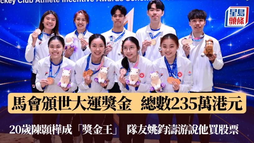 港隊於7月在德國世界大學生運動會共奪得2金1銀4銅,香港大專體育協會周五晚在馬會沙田會所舉行祝捷會暨「賽馬會優秀運動員獎勵計劃」頒發獎金共235萬港元,獎金大戶頭3名是1金(男雙)1銅(混雙)的乒球新星陳顥樺(60萬港元)、其男雙金牌拍檔姚鈞濤及女重一姐佘繕妡以50萬港元同列次位,鈞濤坦言會拿獎金去買股票,還打算游說顥樺也不防一試。