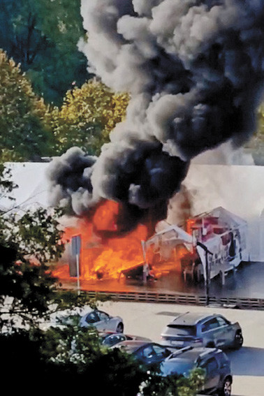 貝爾格萊德議會大廈前一頂燃燒的帳篷冒出濃煙。路透社