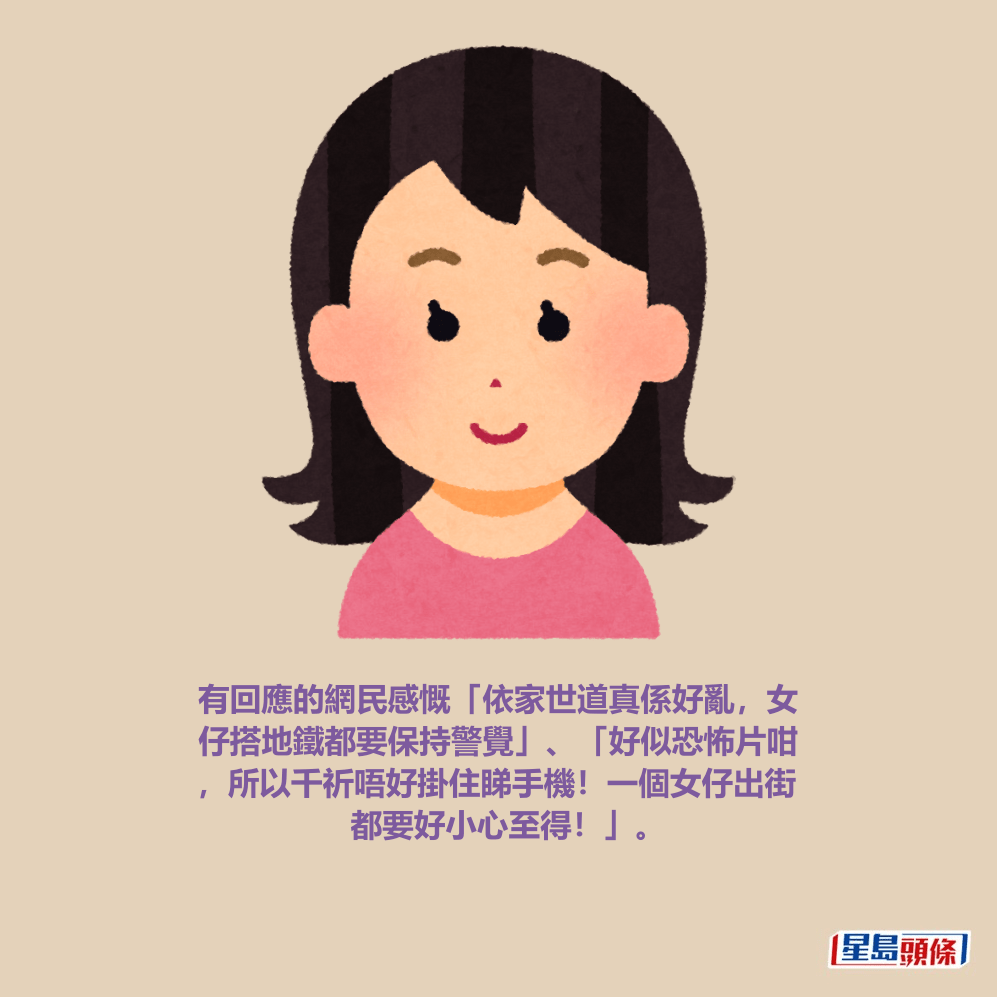 有回應的網民感慨「依家世道真係好亂,女仔搭地鐵都要保持警覺」、「好似恐怖片咁,所以千祈唔好掛住睇手機!一個女仔出街都要好小心至得!」。