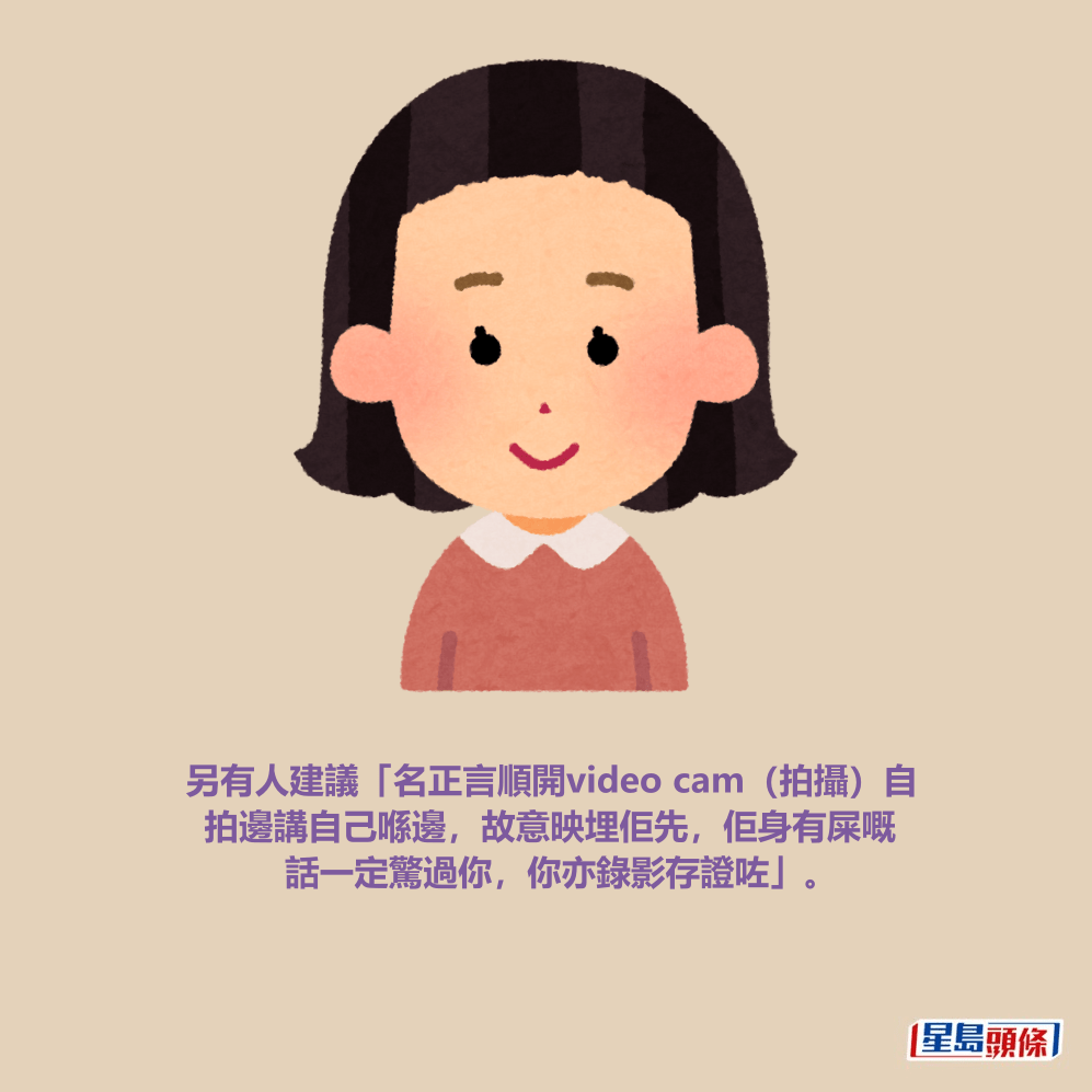 另有人建議「名正言順開video cam(拍攝)自拍邊講自己喺邊,故意映埋佢先,佢身有屎嘅話一定驚過你,你亦錄影存證咗」。