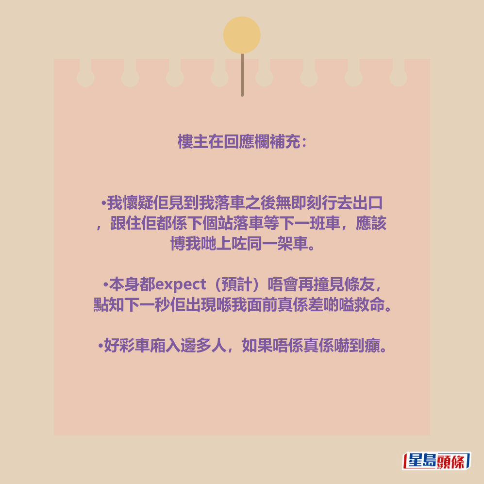 樓主接著稱:「咁我就等下一班列車來再上車,中途我都有同男朋友call(聊天)+同朋友keep(保持)住聯絡,上咗車之後發現人都幾多,咁我左望望右望望好似無見到佢就搵個位置坐低咗,點知!!!我坐低1分鐘唔夠就見到條友喺後邊車廂行過嚟???嗰下真係起晒雞皮以為自己睇緊恐怖片,咁我就一直睥住佢,佢可能都知我已經對佢有戒備所以無坐低喺我附近,佢一直行去前面車廂,跟住我就同佢行反方向,到站一開門之後即刻狂奔返屋企」。