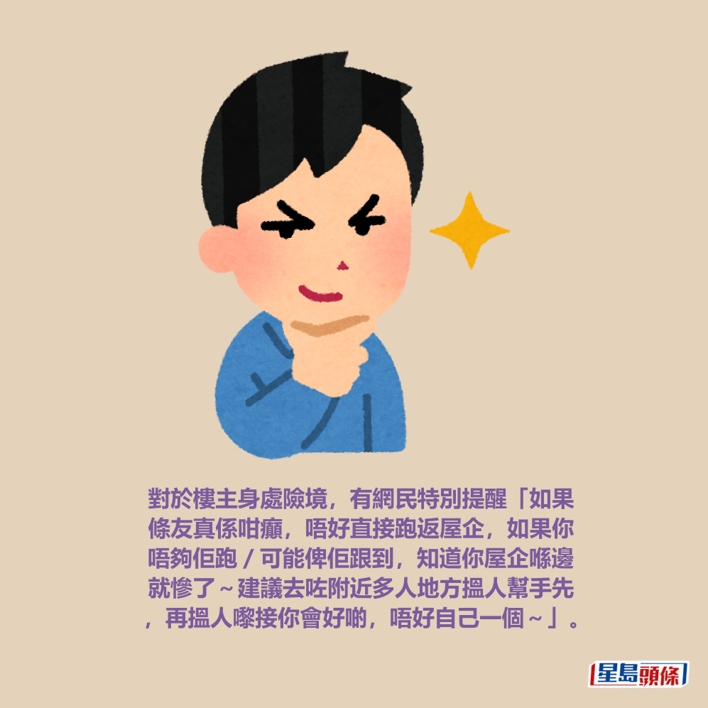 對於樓主身處險境,有網民特別提醒「如果條友真係咁癲,唔好直接跑返屋企,如果你唔夠佢跑/可能俾佢跟到,知道你屋企喺邊就慘了~建議去咗附近多人地方搵人幫手先,再搵人嚟接你會好啲,唔好自己一個~」。