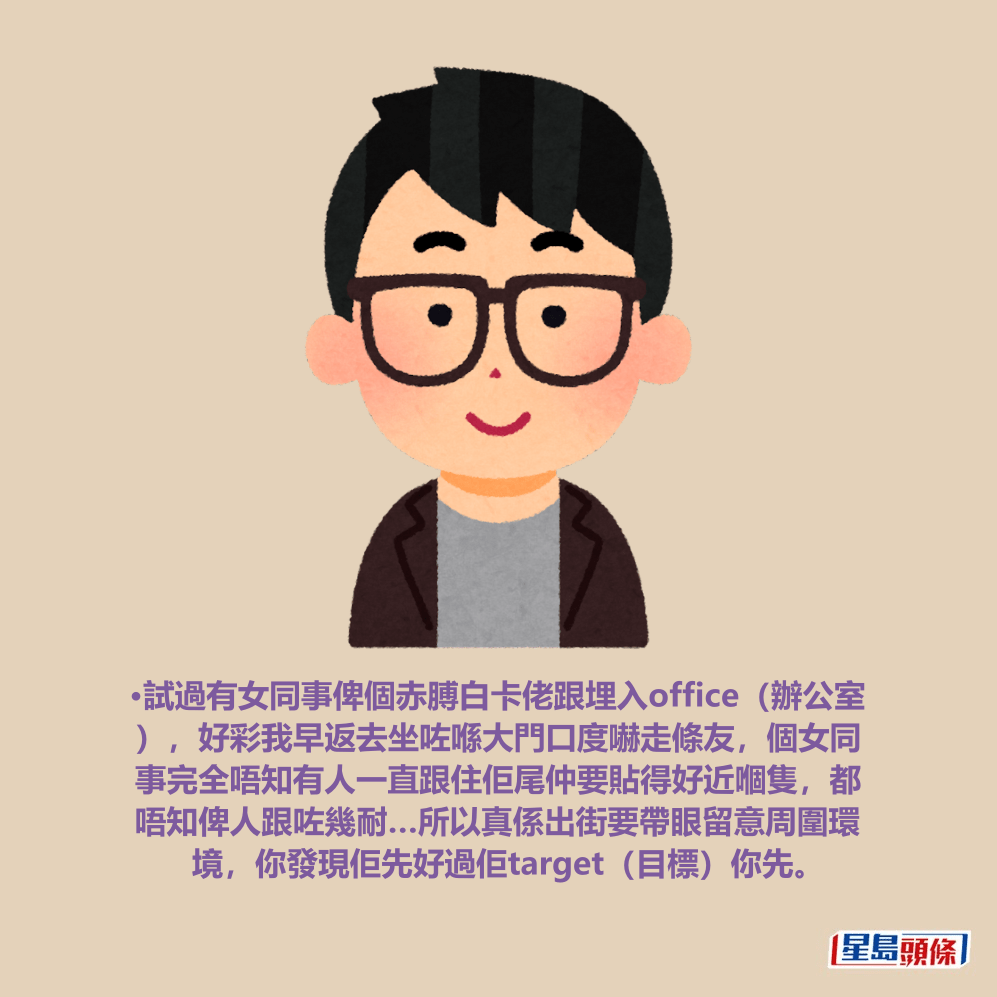 •試過有女同事俾個赤膊白卡佬跟埋入office(辦公室),好彩我早返去坐咗喺大門口度嚇走條友,個女同事完全唔知有人一直跟住佢尾仲要貼得好近嗰隻,都唔知俾人跟咗幾耐…所以真係出街要帶眼留意周圍環境,你發現佢先好過佢target(目標)你先。
