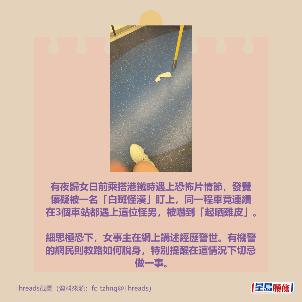 有夜歸女日前乘搭港鐵時遇上恐怖片情節,發覺懷疑被一名「白斑怪漢」盯上,同一程車竟連續在3個車站都遇上這位怪男,被嚇到「起晒雞皮」。細思極恐下,女事主在網上講述經歷警世。有機警的網民則教路如何脫身,特別提醒在這情況下切忌做一事。詳情見下圖及下文: