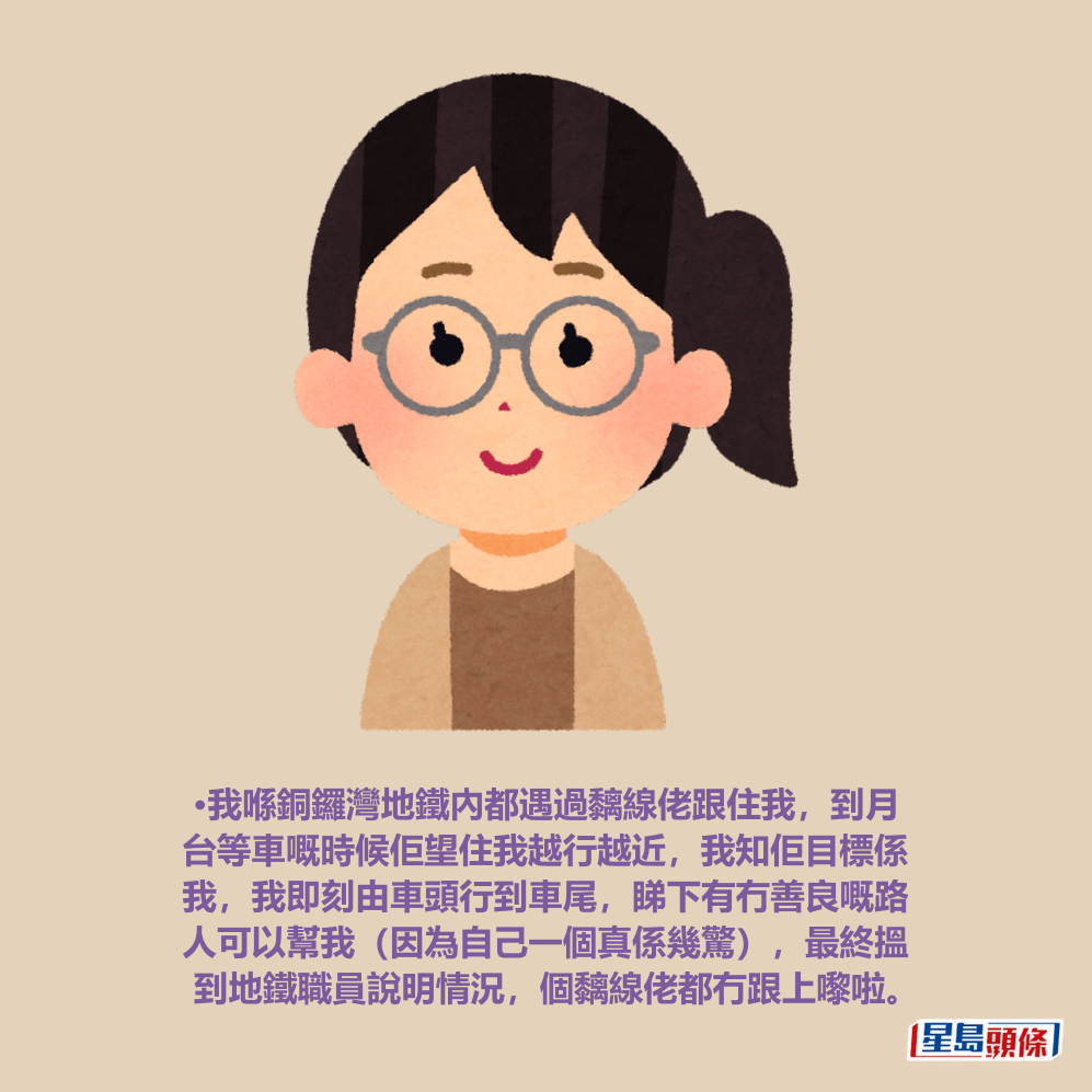 •我喺銅鑼灣地鐵內都遇過黐線佬跟住我,到月台等車嘅時候佢望住我越行越近,我知佢目標係我,我即刻由車頭行到車尾,睇下有冇善良嘅路人可以幫我(因為自己一個真係幾驚),最終搵到地鐵職員說明情況,個黐線佬都冇跟上嚟啦。