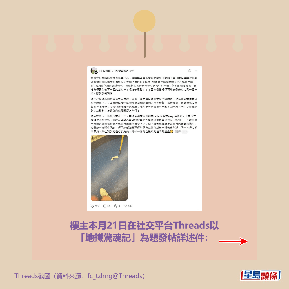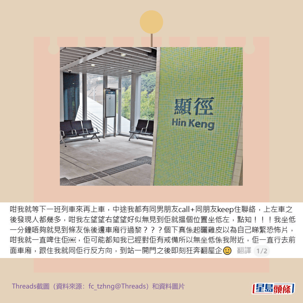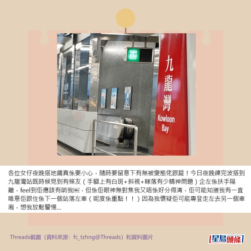 樓主本月21日在社交平台Threads以「地鐵驚魂記」為題發帖詳述件:「各位女仔夜晚搭地鐵真係要小心,隨時要留意下有無被變態佬跟蹤!今日夜晚練完波搭到九龍灣站嘅時候見到有條友(手腳上有白斑+斜視+睇落有少精神問題)企咗喺扶手隔離,feel(感覺)到佢應該有哨我,但係佢眼神無對焦我又唔係好分得清,佢可能知道我有一直為意佢跟住喺下一個站落咗車(呢度係重點!!)因為我懷疑佢可能專登走咗去另一個車廂,想我放鬆警惕…」。