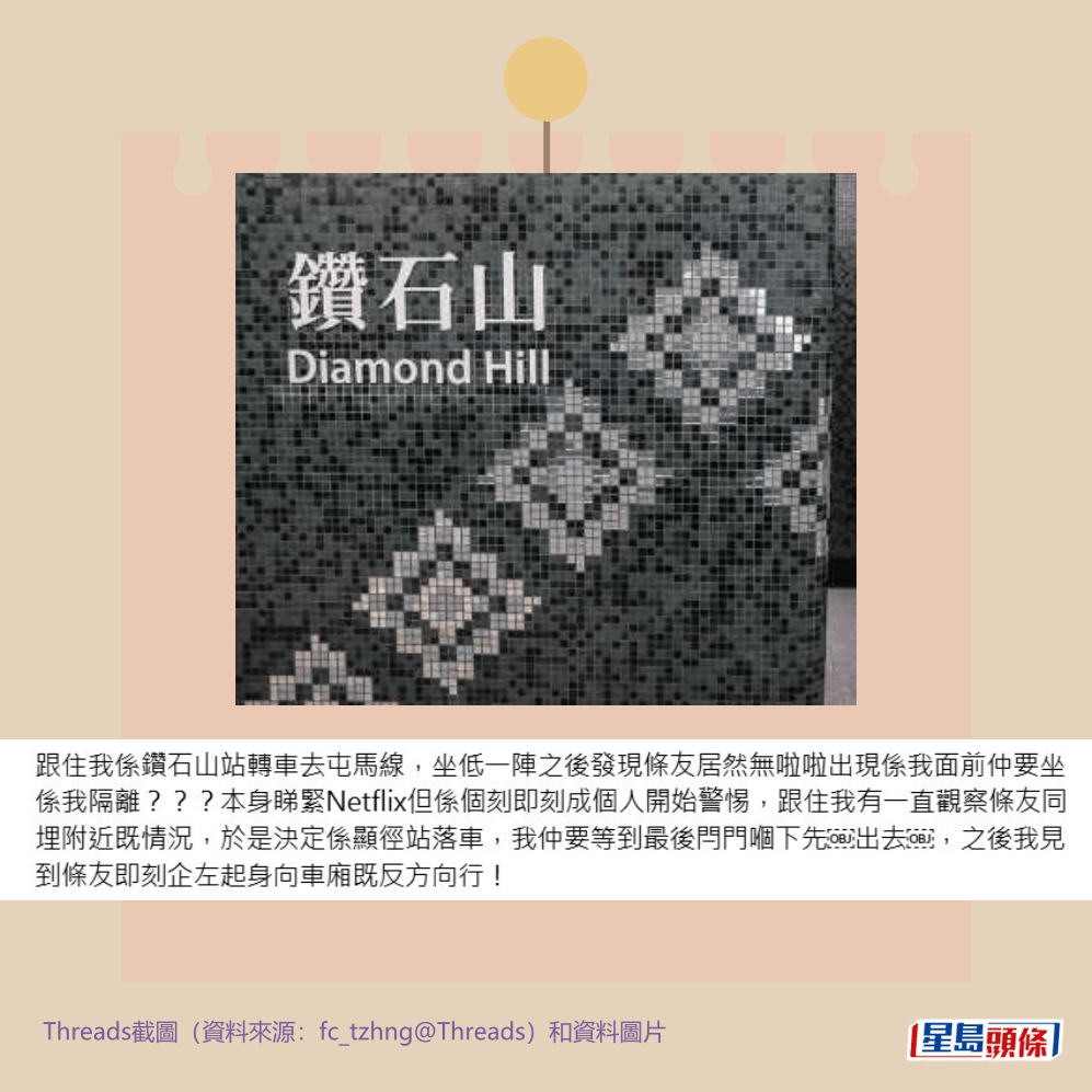 樓主續指:「跟住我喺鑽石山站轉車去屯馬綫,坐低一陣之後發現條友居然無啦啦出現喺我面前仲要坐喺我隔離???本身睇緊Netflix(電影)但喺個刻即刻成個人開始警惕,跟住我有一直觀察條友同埋附近嘅情況,於是決定喺顯徑站落車,我仲要等到最後閂門嗰下先出去 ,之後我見到條友即刻企咗起身向車廂嘅反方向行!」。