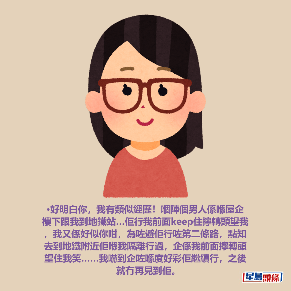 •好明白你,我有類似經歷!嗰陣個男人係喺屋企樓下跟我到地鐵站…佢行我前面keep住擰轉頭望我,我又係好似你咁,為咗避佢行咗第二條路,點知去到地鐵附近佢喺我隔離行過,企係我前面擰轉頭望住我笑……我嚇到企咗喺度好彩佢繼續行,之後就冇再見到佢。