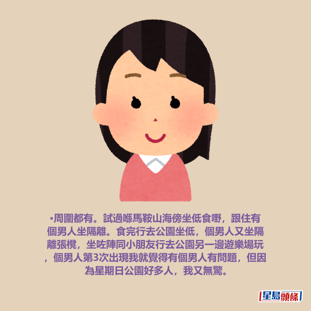•周圍都有。試過喺馬鞍山海傍坐低食嘢,跟住有個男人坐隔離。食完行去公園坐低,個男人又坐隔離張櫈,坐咗陣同小朋友行去公園另一邊遊樂場玩,個男人第3次出現我就覺得有個男人有問題,但因為星期日公園好多人,我又無驚。