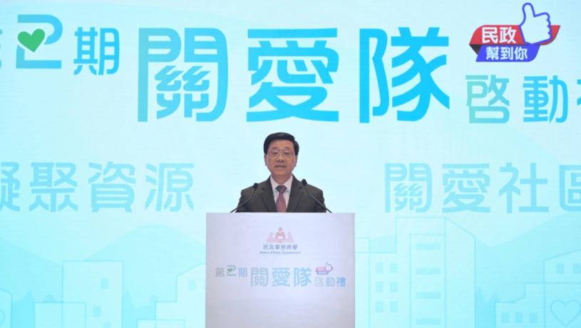 民政事務總署今日(24日)在政府總部舉行第二期關愛隊啟動禮,行政長官李家超在民政及青年事務局局長麥美娟陪同下主持啟動儀式。李家超致辭時表示,關愛隊已成為完善地區治理的重要一環,並讚揚其扶弱睦鄰、協同高效。