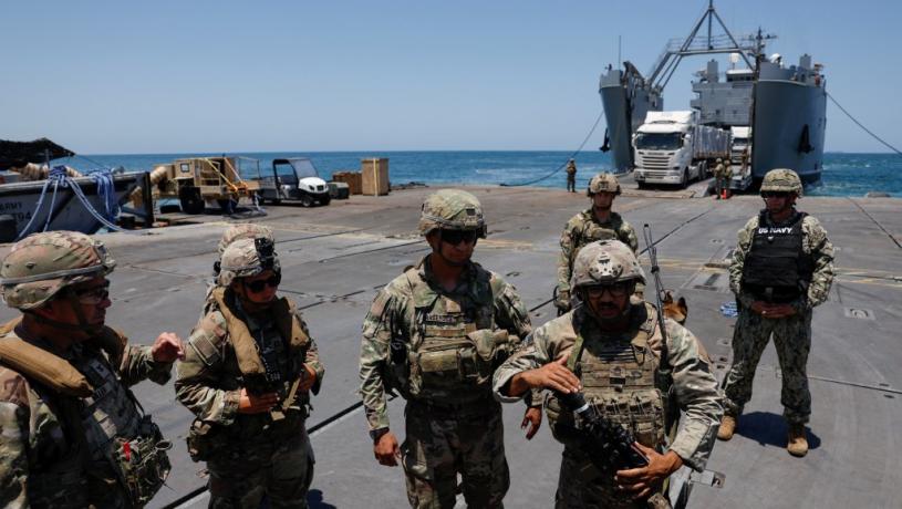 美國海軍陸戰隊士兵在以色列士兵的陪同下,在以色列南部克法爾阿扎基布茲附近地區行走。 美聯社