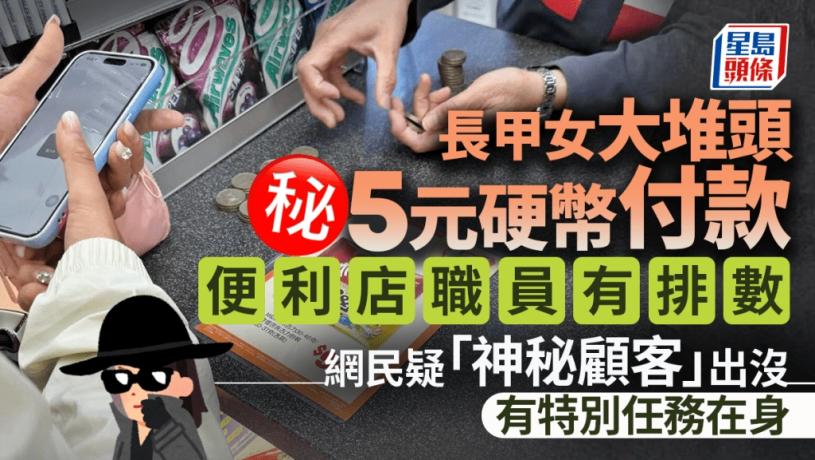 一名修著長手甲的女顧客,早前懷疑拿著大堆頭的5元硬幣付款,便利店職員在收銀櫃枱前細心點算。網民則懷疑這位長甲女子是便利店的「神秘顧客」,有特別任務在身。詳情見下圖及下文: