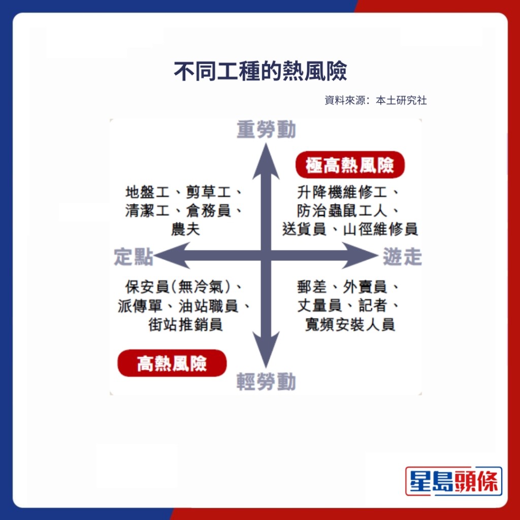 本土研究社研究員梁日恒指,過去屢有中暑意外在非「暑熱警告」生效時發生,制度成效存疑,團隊遂以勞動量及工作範圍兩個維度,分析本地勞工面對的「熱風險」(見表)。研究發現,同一工種在不同工作環境下的熱風險有異,例如部分護士需要出外家訪及送藥,風險高於留院者;部分保安亭設有空調,卻為慳電未開啟,「難以工種訂定保障。」