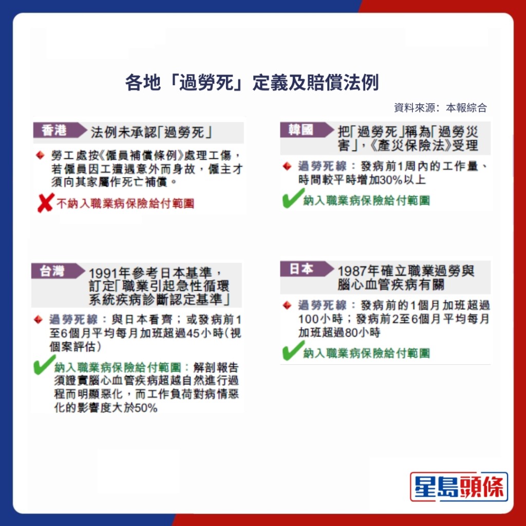 回望香港,根據政府統計處最新數據,2024年5月至6月,全港有28.3萬名僱員每周工作56小時或以上,當中更有逾5萬人達72小時或以上。工業傷亡權益會幹事謝欣然指,數據足以證明不少打工仔已踏入「過勞死線」,「政府可以參照日、韓和台灣,以工作時數定義『過勞』。」她不直言,立法困難在於官方態度消極,未看到問題的嚴重性,「我們不是質問為何『人有我無』,而是香港存在相關問題需要解決。其他地區有行之有效且完備的方案,香港是否可以參考?」