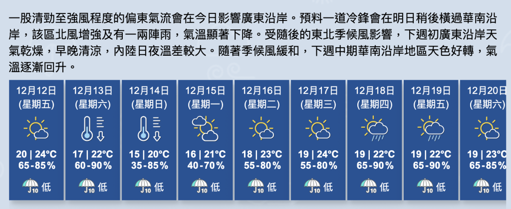 ⾸⾴ 即時港聞 天文台|最高氣溫約24度 吹和緩至清勁偏東風 明日有雨氣溫顯著下降 2025-12-11 16:01:00 一股清勁至強風程度的偏東氣流正影響廣東沿岸。 本港地區今日大致多雲。日間部分時間有陽光,最高氣溫約24度。吹和緩至清勁偏東風,離岸及高地間中吹強風。 日間部分時間有陽光,最高氣溫約24度。蔡楚輝攝 日間部分時間有陽光,最高氣溫約24度。蔡楚輝攝 日間部分時間有陽光,最高氣溫約24度。蔡楚輝攝 展望未來一兩日風勢仍然頗大。明日稍後轉吹北風,有一兩陣雨,氣溫顯著下降。星期日及星期一市區最低氣溫在15、16度左右,新界再低兩三度。