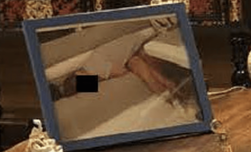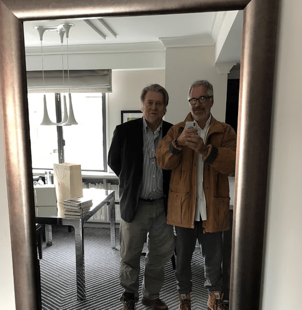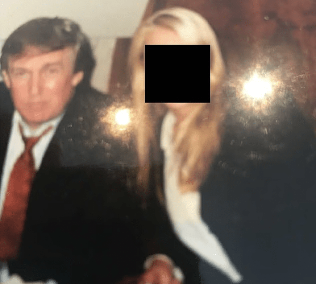 該照片是愛潑斯坦於2018至2019年間,與右翼政治策略家史蒂夫·班農(Steve Bannon)在書房會面時所拍攝。照片中,愛潑斯坦書桌右角處擺放著一個相框,朝向他本人的方向。儘管相中人的臉部已被黑色方框遮蓋以保護身份,但其內容已在社交媒體上引發「令人高度不安」的猜測。