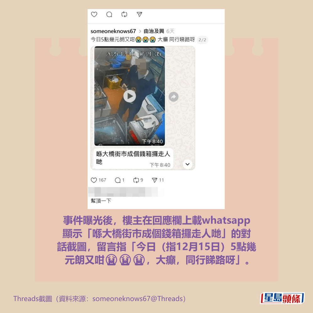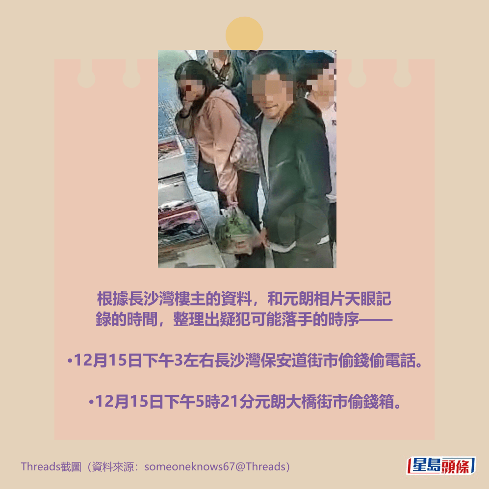 樓主本月15日在社交平台Threads以「尋人問Threads」為題發帖,上載相片尋人,指「15/12/25下午3時點左右,長沙灣保安道(街市),呢個人扮晒嘢喺街市買餸,左揀右揀,揀咗十幾分鐘,檔主一背向佢就伸手去偷晒成袋錢同電話!有無人識佢?pm(Private Message,私訊)只求追得返個電話(家母大量珍貴回憶喺電話) 」。