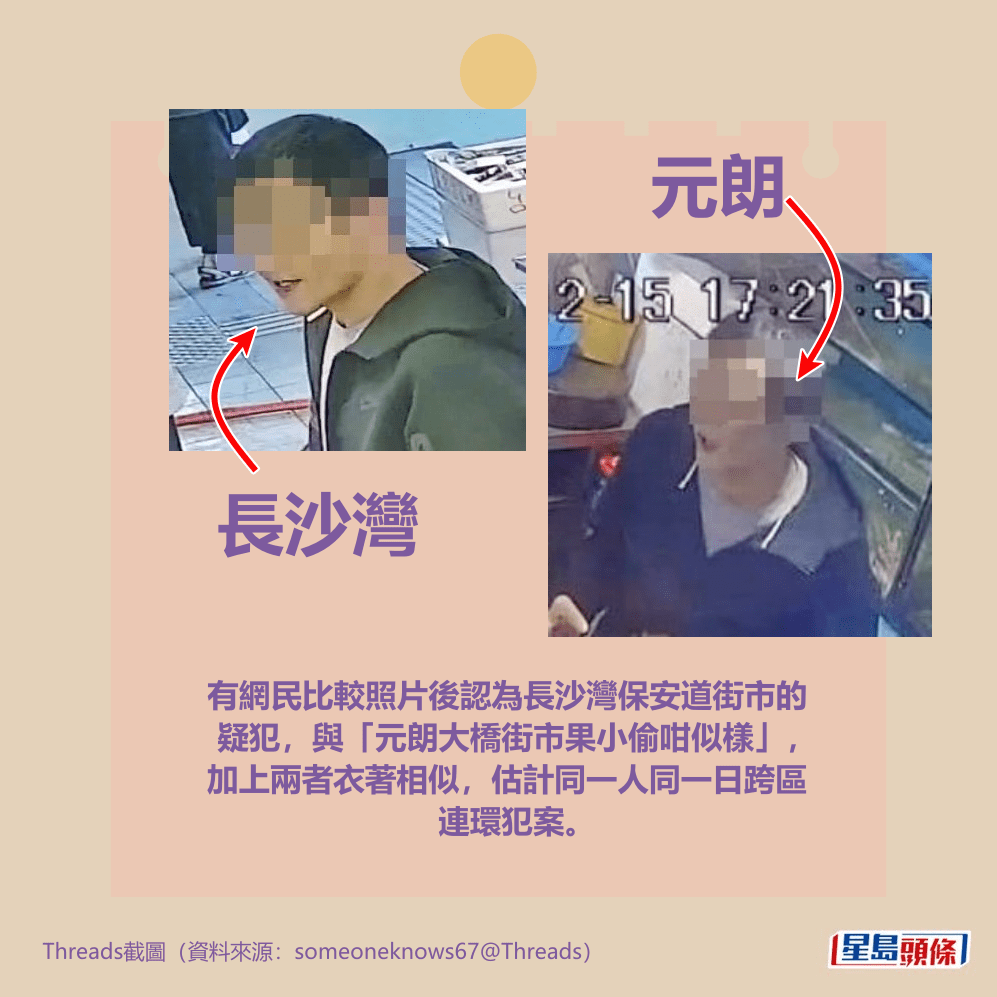 有網民比較照片後認為長沙灣保安道街市的疑犯,與「元朗大橋街市果小偷咁似樣」,加上兩者衣著相似,估計同一人同一日跨區連環犯案。