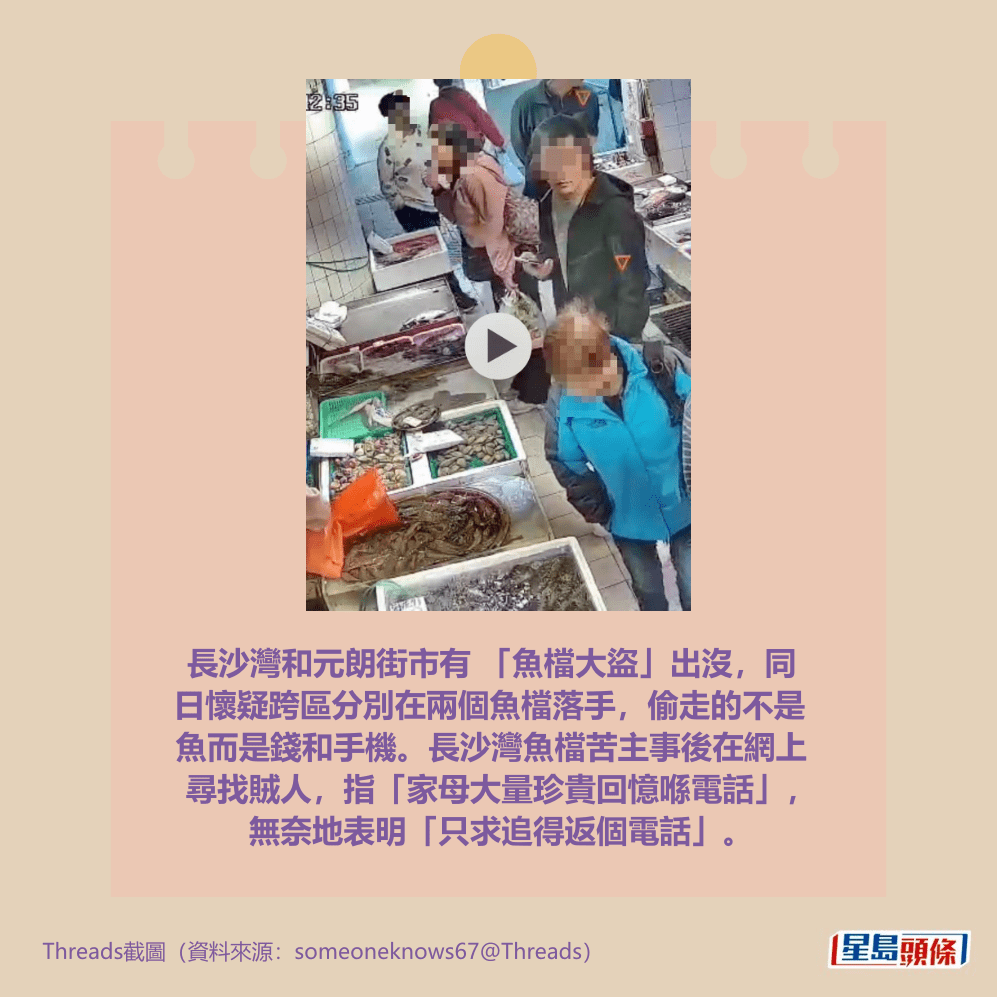 長沙灣和元朗街市有 「魚檔大盜」出沒,同日懷疑跨區分別在兩個魚檔落手,偷走的不是魚而是錢和手機。長沙灣魚檔苦主事後在網上尋找賊人,指「家母大量珍貴回憶喺電話」,無奈地表明「只求追得返個電話」。詳情見下圖及下文: