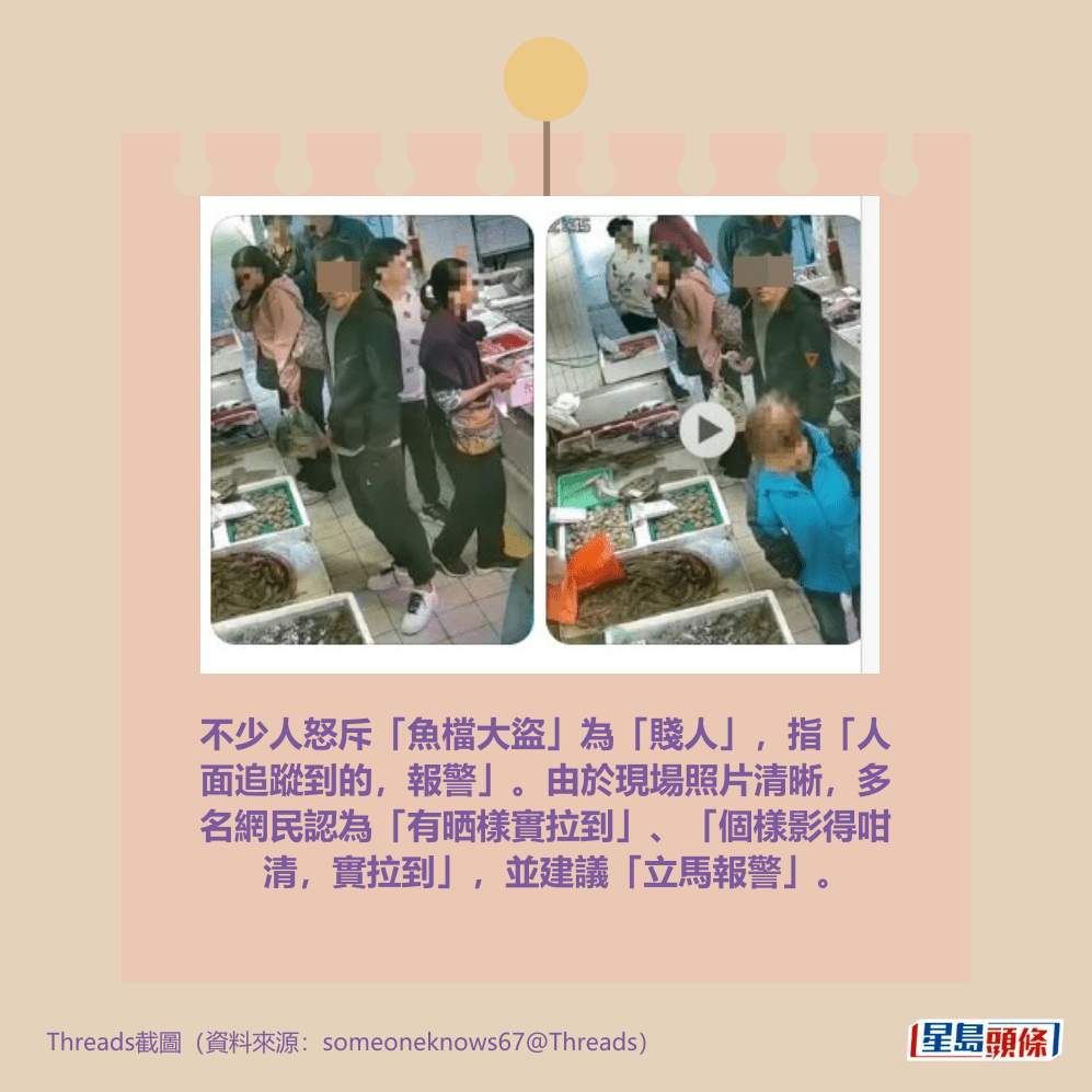 不少人怒斥「魚檔大盜」為「賤人」,指「人面追蹤到的,報警」。由於現場照片清晰,多名網民認為「有晒樣實拉到」、「個樣影得咁清,實拉到」,並建議「立馬報警」。