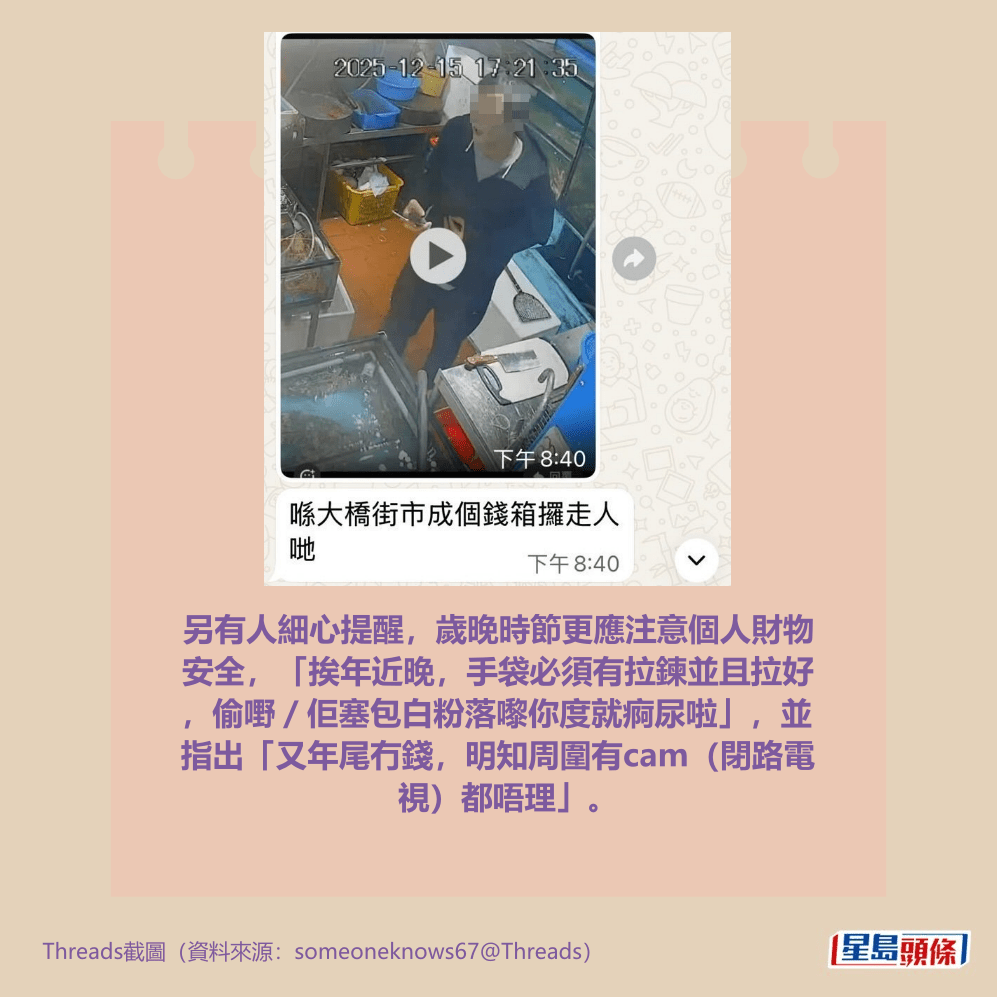 另有人細心提醒,歲晚時節更應注意個人財物安全,「挨年近晚,手袋必須有拉鍊並且拉好,偷嘢/佢塞包白粉落嚟你度就痾尿啦」,並指出「又年尾冇錢,明知周圍有cam(閉路電視)都唔理」。