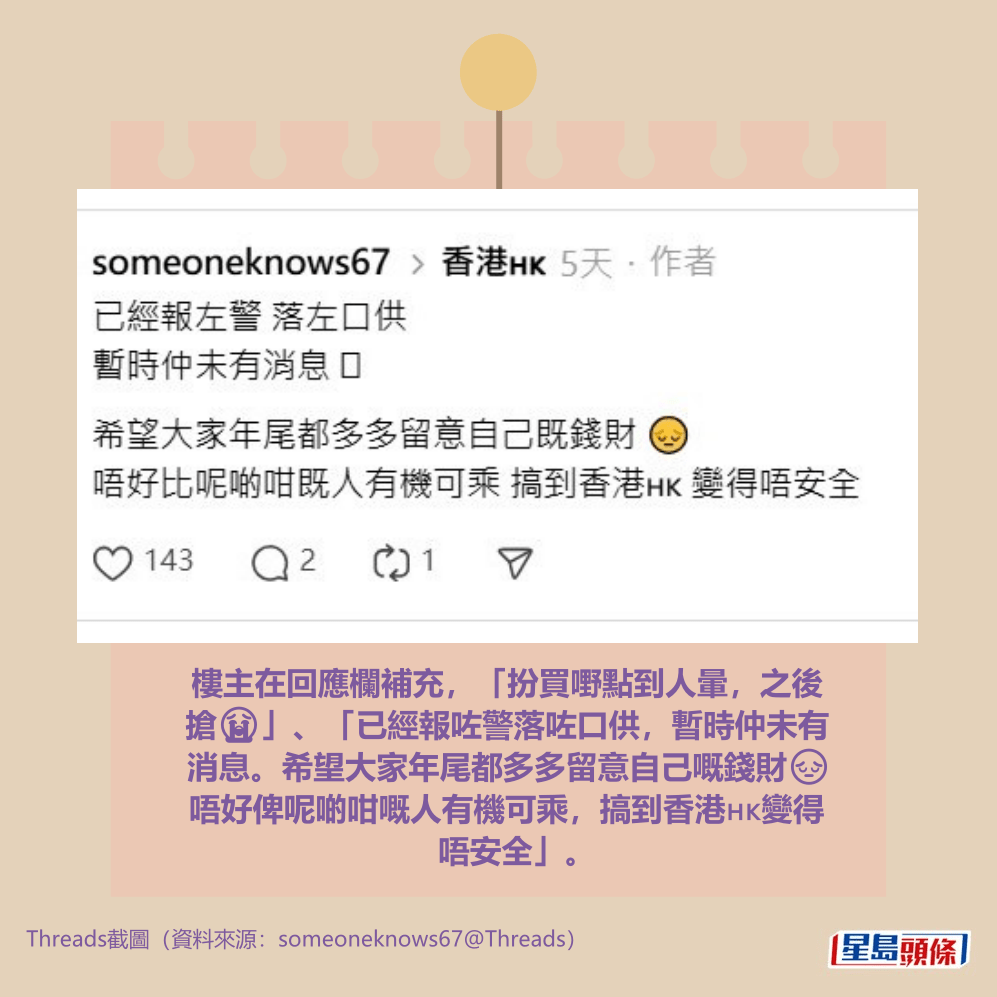 樓主在回應欄補充,「扮買嘢點到人暈,之後搶😭」、「已經報咗警落咗口供,暫時仲未有消息。希望大家年尾都多多留意自己嘅錢財😔唔好俾呢啲咁嘅人有機可乘,搞到香港🇭🇰變得唔安全」。