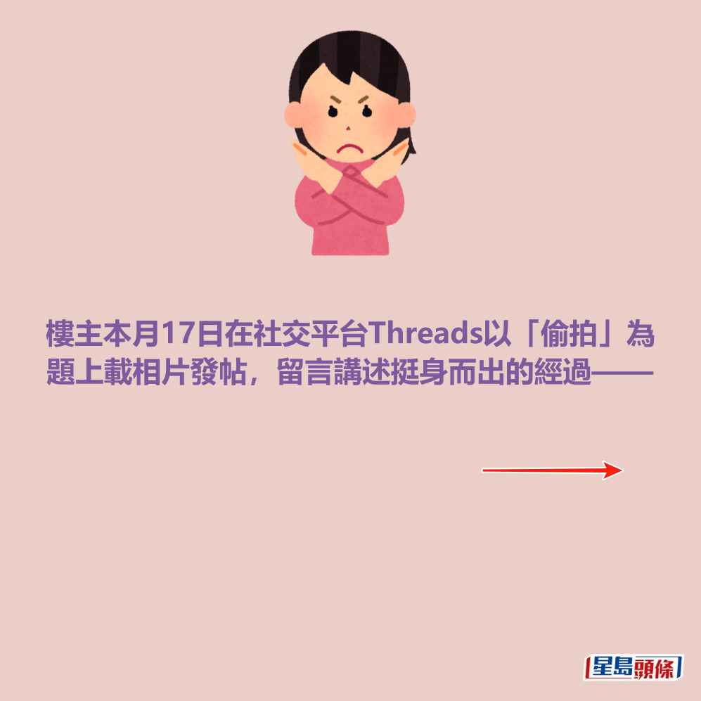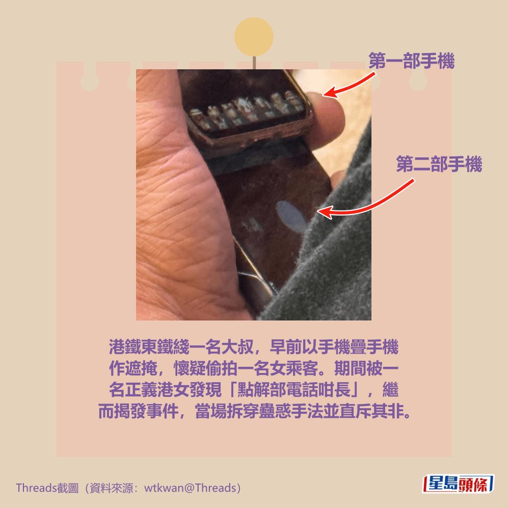 樓主本月17日在社交平台Threads以「偷拍」為題上載相片發帖,留言講述挺身而出的經過——「偷拍真係零容忍!!!!啱啱喺東鐵見到個阿叔打機但點解部電話咁長,本身死八婆嘅我望到佢下面仲有部電話!偷影緊前面個女仔!!!!我影低個阿叔先費事佢一陣話我屈佢」。