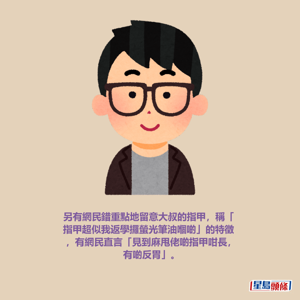 另有網民錯重點地留意大叔的指甲,稱「指甲超似我返學攞螢光筆油嗰啲」的特徵,有網民直言「見到麻甩佬啲指甲咁長,有啲反胃」。