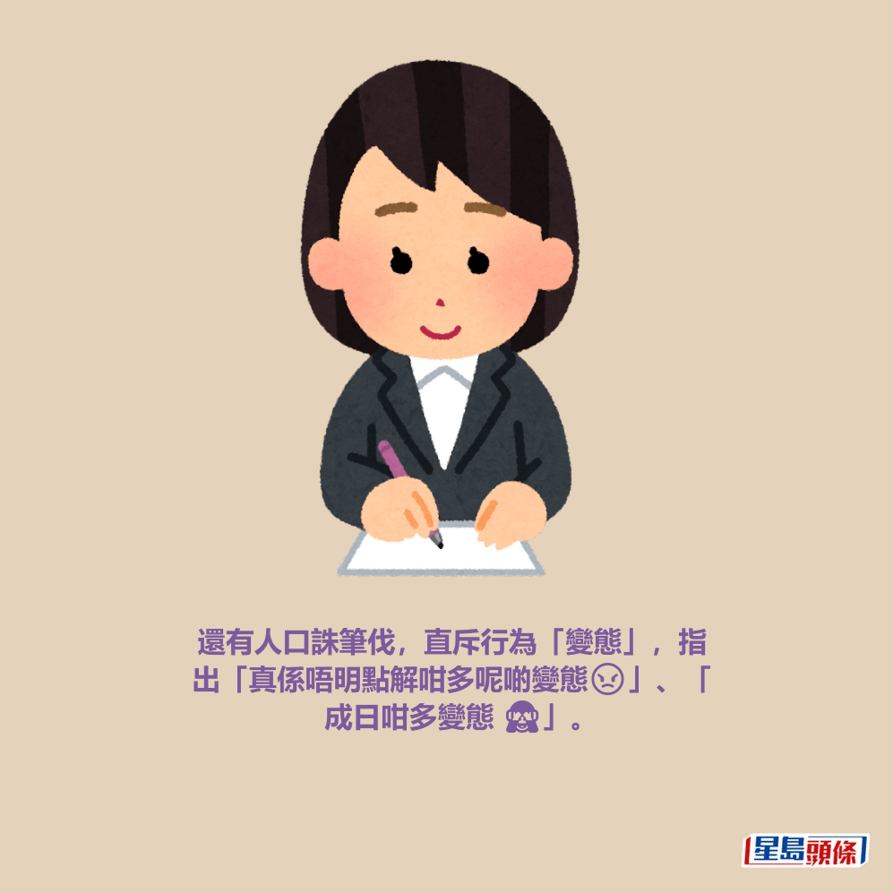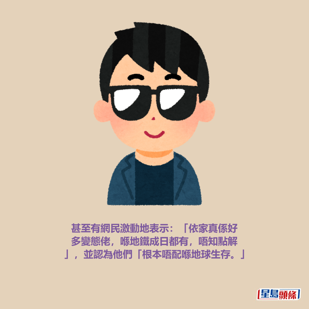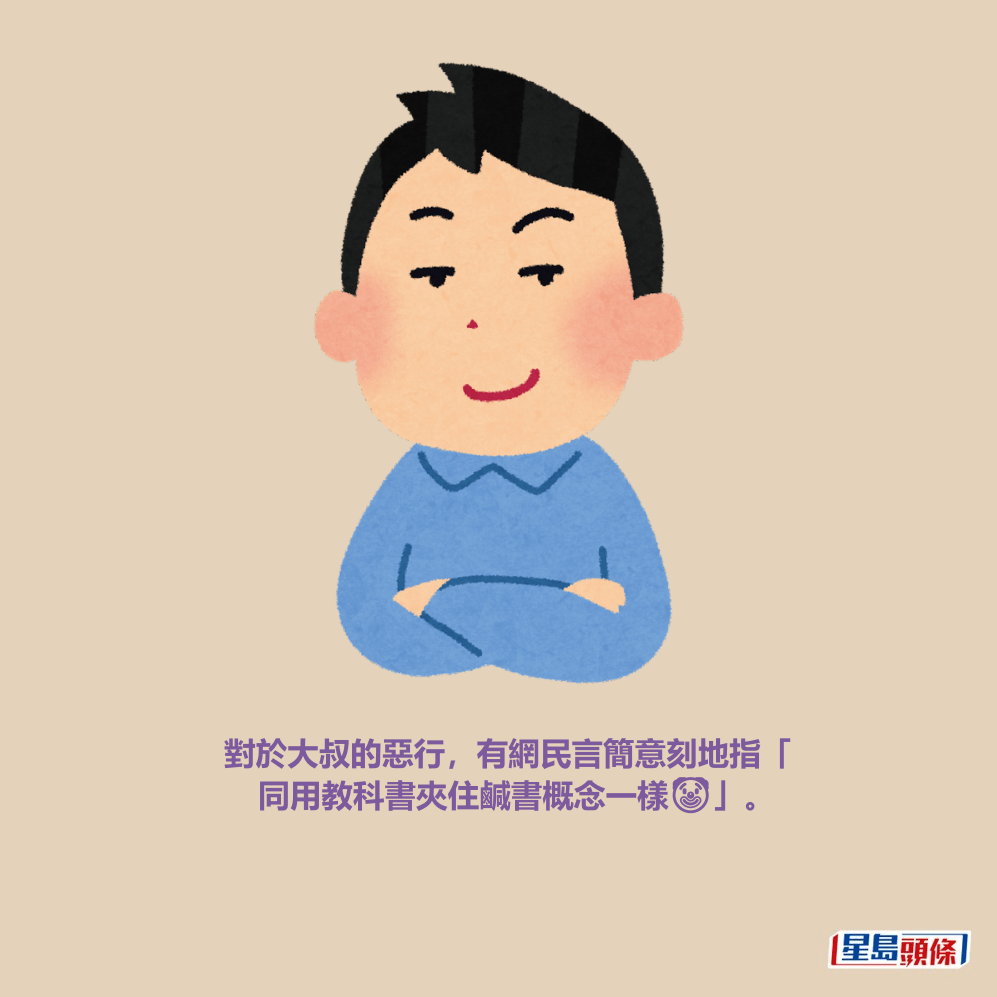 對於大叔的惡行,有網民言簡意刻地指「同用教科書夾住鹹書概念一樣🤡」;另有人口誅筆伐,直斥行為「變態」,指出「真係唔明點解咁多呢啲變態😠」、「成日咁多變態 🙈」,甚至有網民激動地表示:「依家真係好多變態佬,喺地鐵成日都有,唔知點解」,並認為他們「根本唔配喺地球生存。」