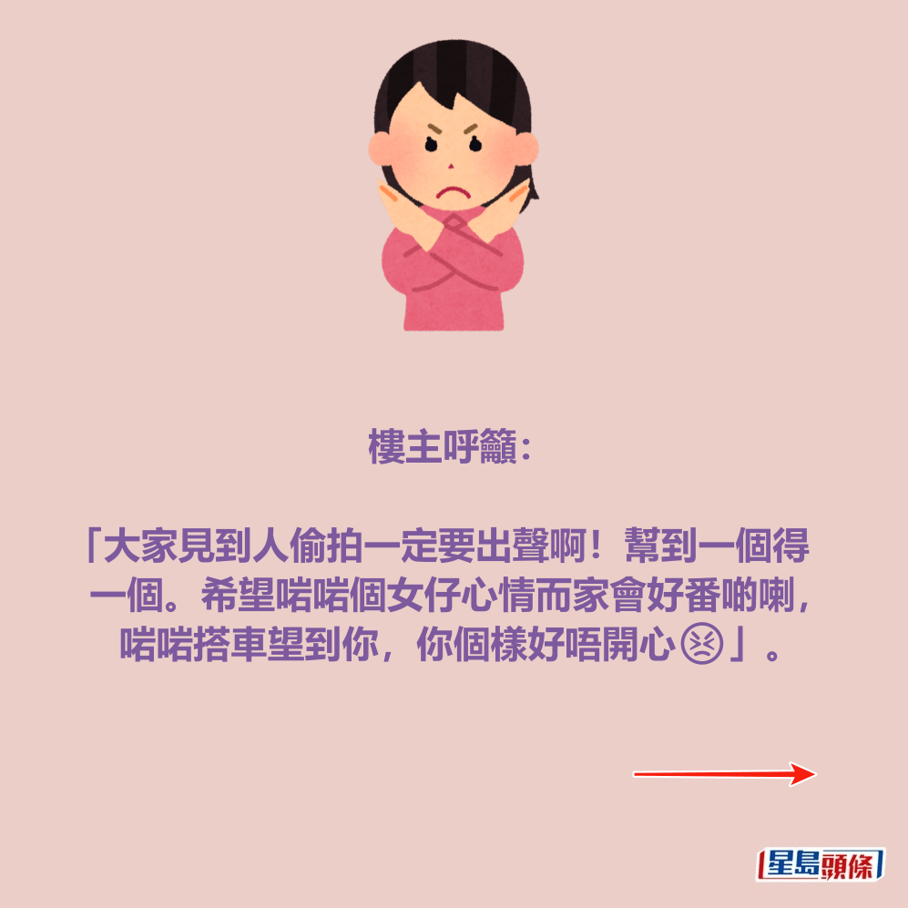 樓主呼籲「大家見到人偷拍一定要出聲啊!幫到一個得一個。希望啱啱個女仔心情而家會好番啲喇,啱啱搭車望到你,你個樣好唔開心😣」。