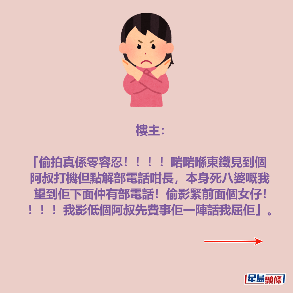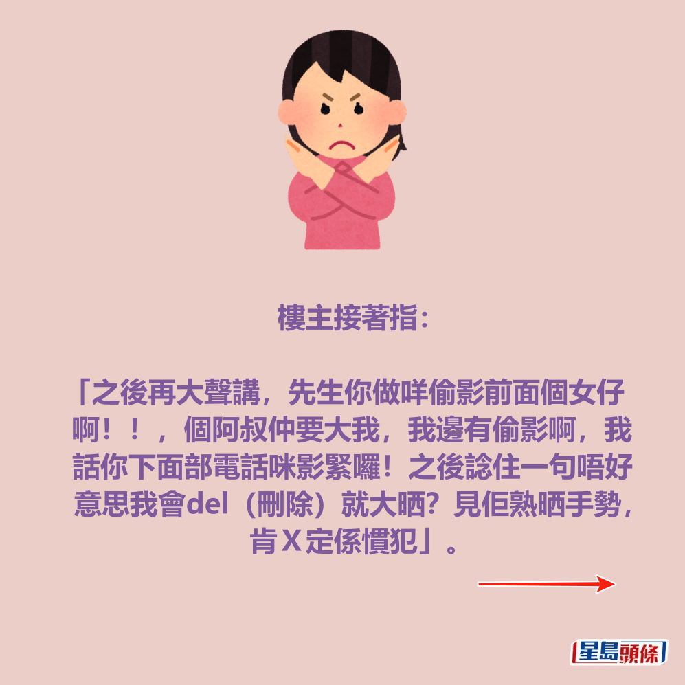 樓主接著指「之後再大聲講,先生你做咩偷影前面個女仔啊!!,個阿叔仲要大我,我邊有偷影啊,我話你下面部電話咪影緊囉!之後諗住一句唔好意思我會del(刪除)就大晒?見佢熟晒手勢,肯X定係慣犯」。