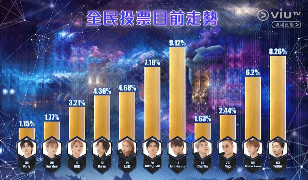 ViuTV皇牌節目《全民造星VI》總決賽將於今晚(4日)在澳門舉行,ViuTV亦會直播總決賽,十強參賽者5號郭民鋒(Kris)、6號 張肇維(Gordon)、12號 陳曉希(小雞)、19號黃日禧(Dave)、34號丘藍、41號范卓賢(Jacky Fan)、43號陳瑨羲(Ian hannz)、52號李學偉(DaiMa)、73號 陳頴業Yip sir、92號關曉隆(Bosco Kwan)將會爭取三甲席位。完成第一回合後,COLLAR出場表演,跳唱《Riding High》,強尼之後公布全民投票目前走勢,先由Ian Hannz領先,獲得9.12%。