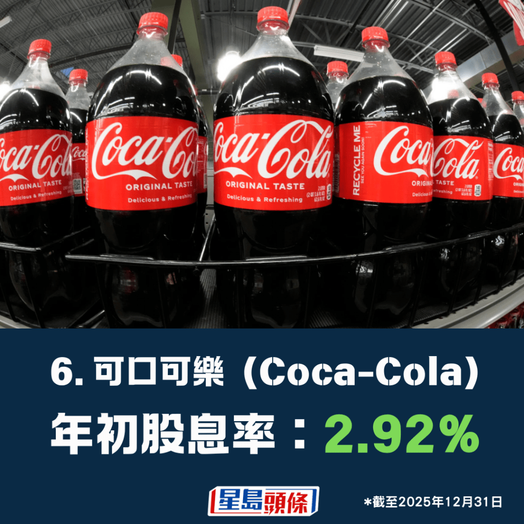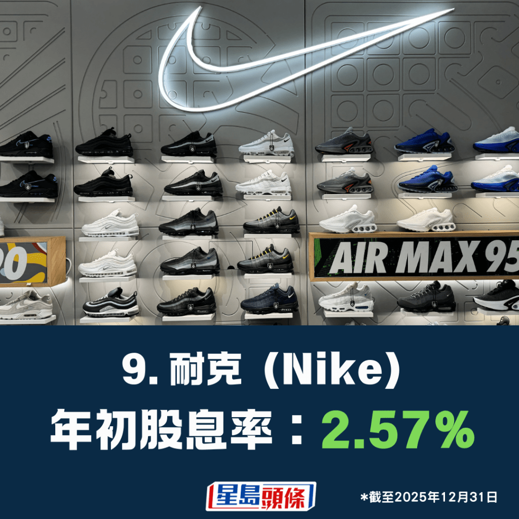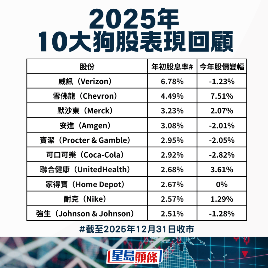 以2025年過去12個月派息計算,道指最高股息率的10隻股份則為威訊、雪佛龍、默沙東、安進、寶潔、可口可樂、聯合健康(UnitedHealth)、家得寶(Home Depot)、Nike及強生。相較於2025年的狗股名單,僅僅換位了3間公司,即麥當勞、IBM及思科被聯合健康、家得寶和Nike所取代。而2026年的狗股名單板塊亦較為分散,當中醫療保健佔4隻、日用消費品佔2隻、非必需品佔2隻,能源、通訊各佔1隻。