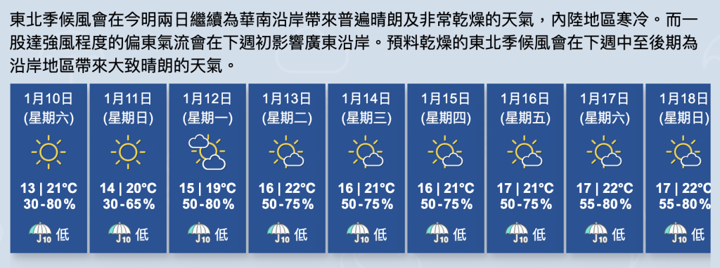 展望明日非常乾燥,早上相當清涼,稍後東風增強。星期一雲量較多,隨後兩三日大致天晴,日間和暖。