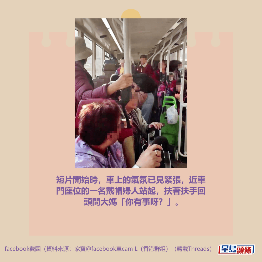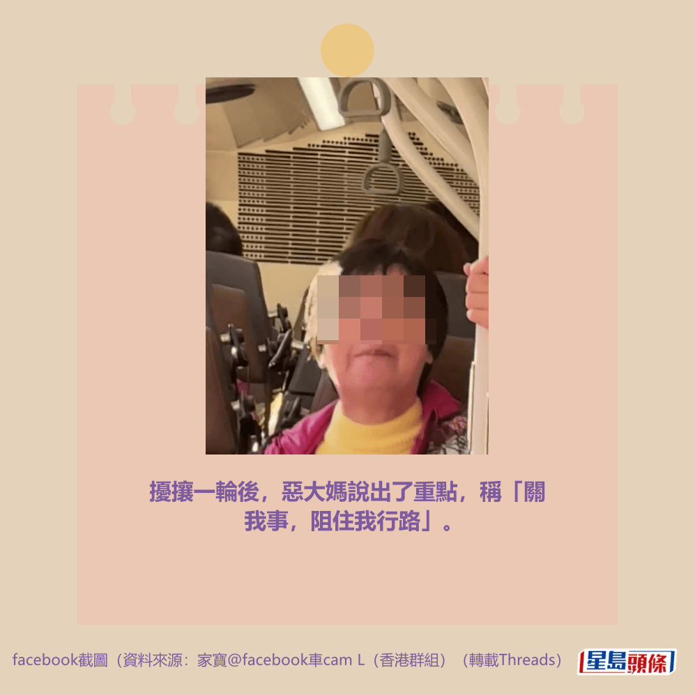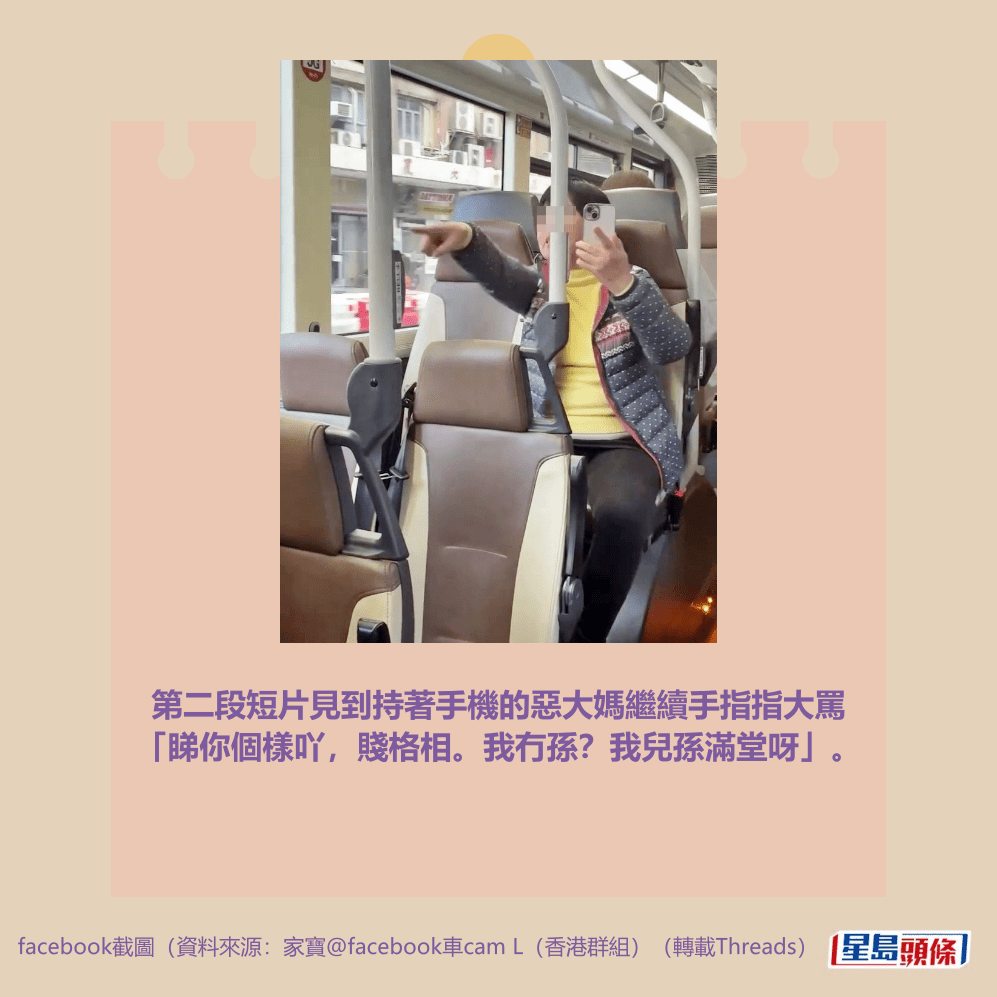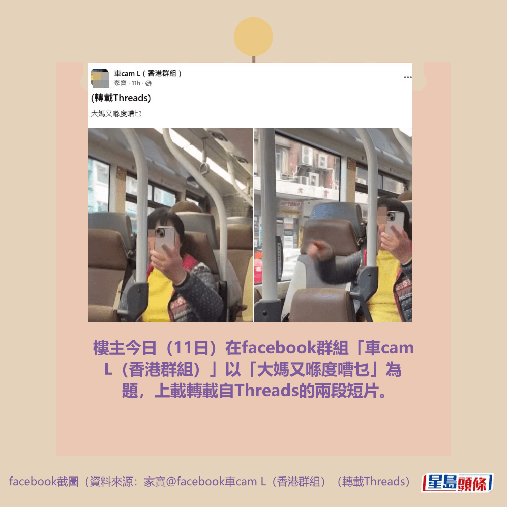 樓主今日(11日)在facebook群組「車cam L(香港群組)」以「大媽又喺度嘈乜」為題,上載轉載自Threads的兩段短片。