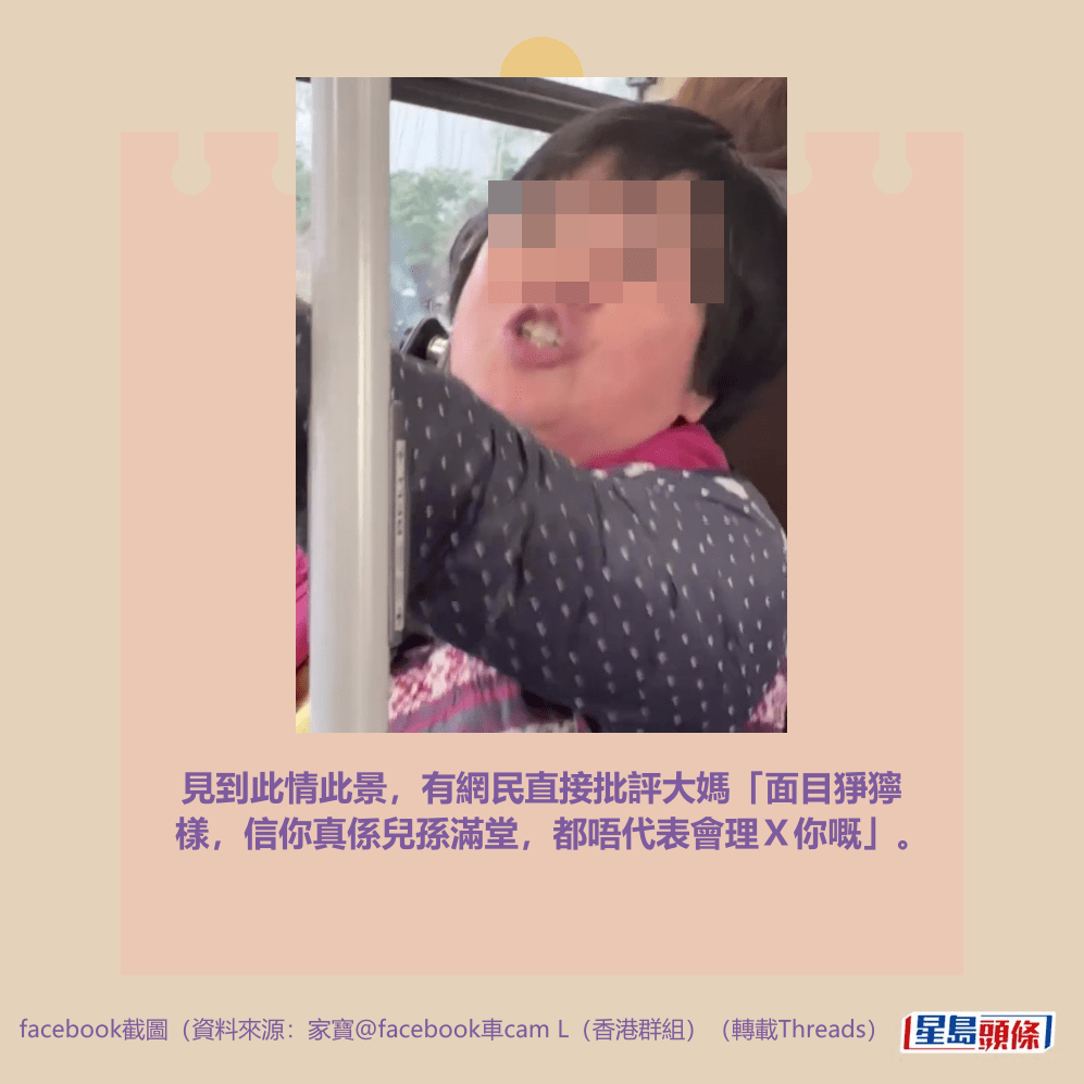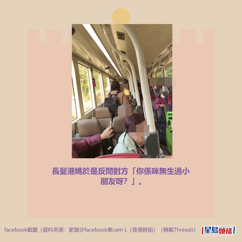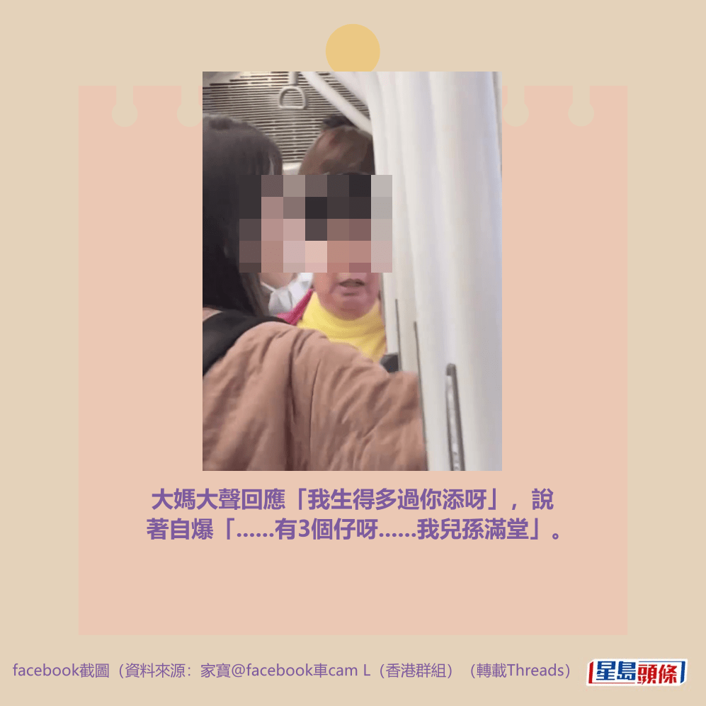 長髮港媽於是反問對方「你係咪無生過小朋友呀?」。大媽大聲回應「我生得多過你添呀」,說著自爆「……有3個仔呀……我兒孫滿堂」。旁人知道惡大媽兒孫滿堂後,於是質疑「生咁多都唔體諒人」。