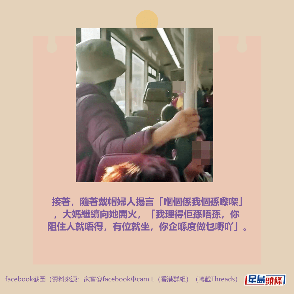 接著,隨著戴帽婦人揚言「嗰個係我個孫嚟㗎」,大媽繼續向她開火,「我理得佢孫唔孫,你阻住人就唔得,有位就坐,你企喺度做乜嘢吖」。