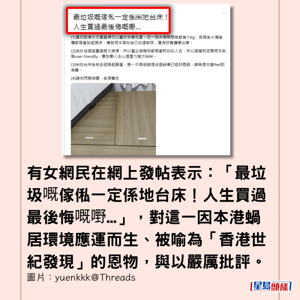 該位女網民在帖文中開首即斬釘截鐵表示:「最垃圾嘅傢俬一定係地台床!人生買過最後悔嘅嘢…」,對這一因本港蝸居環境應運而生的「世紀發現」,與以嚴厲批評。
