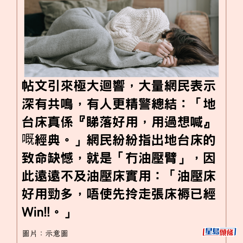 帖文引來極大迴響,大量網民表示深有共鳴,有人更精警總結:「地台床真係『睇落好用,用過想喊』嘅經典。」網民紛紛指出地台床的致命缺憾,就是「冇油壓臂」,因此遠遠不及油壓床實用:「油壓床好用勁多,唔使先拎走張床褥已經Win!!。」