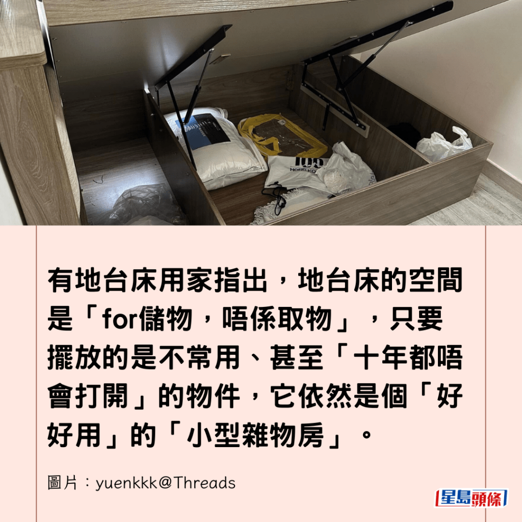 有地台床用家指出,地台床的空間是「for儲物,唔係取物」,只要擺放的是不常用、甚至「十年都唔會打開」的物件,它依然是個「好好用」的「小型雜物房」。