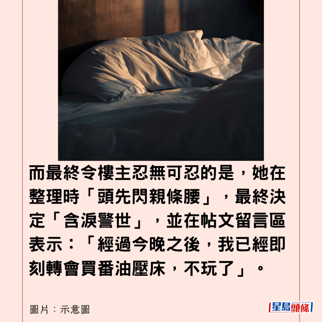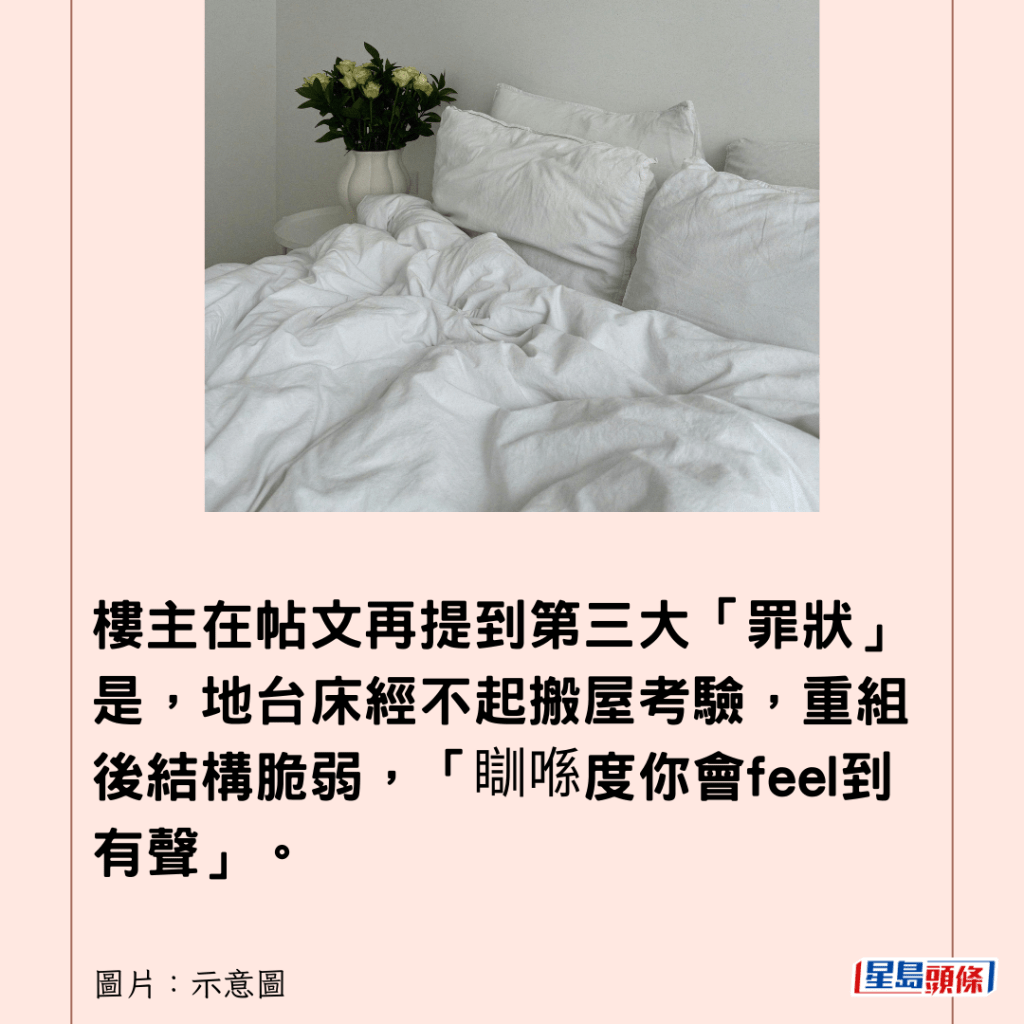 樓主在帖文再提到第三大「罪狀」是,地台床經不起搬屋考驗,重組後結構脆弱,「瞓喺度你會feel到有聲」。而最終令樓主忍無可忍的是,她在整理時「頭先閃親條腰」,最終決定「含淚警世」,並在帖文留言區表示:「經過今晚之後,我已經即刻轉會買番油壓床,不玩了」。