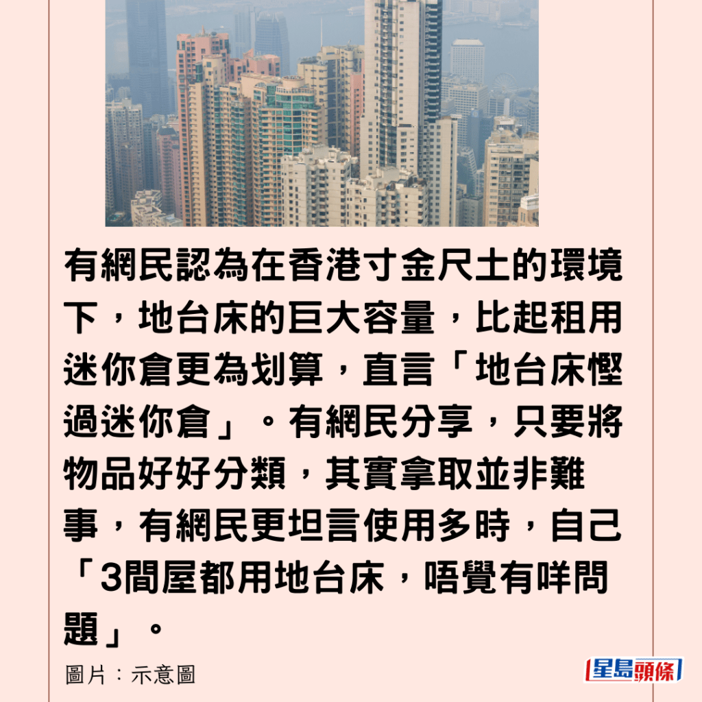 有網民認為在香港寸金尺土的環境下,地台床的巨大容量,比起租用迷你倉更為划算,直言「地台床慳過迷你倉」。有網民分享,只要將物品好好分類,其實拿取並非難事,有網民更坦言使用多時,自己「3間屋都用地台床,唔覺有咩問題」。