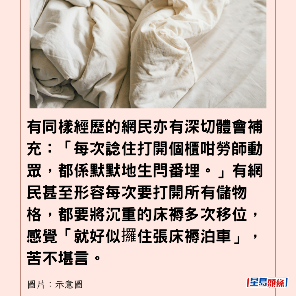 有同樣經歷的網民亦有深切體會補充:「每次諗住打開個櫃咁勞師動眾,都係默默地生閂番埋。」有網民甚至形容每次要打開所有儲物格,都要將沉重的床褥多次移位,感覺「就好似攞住張床褥泊車」,苦不堪言。