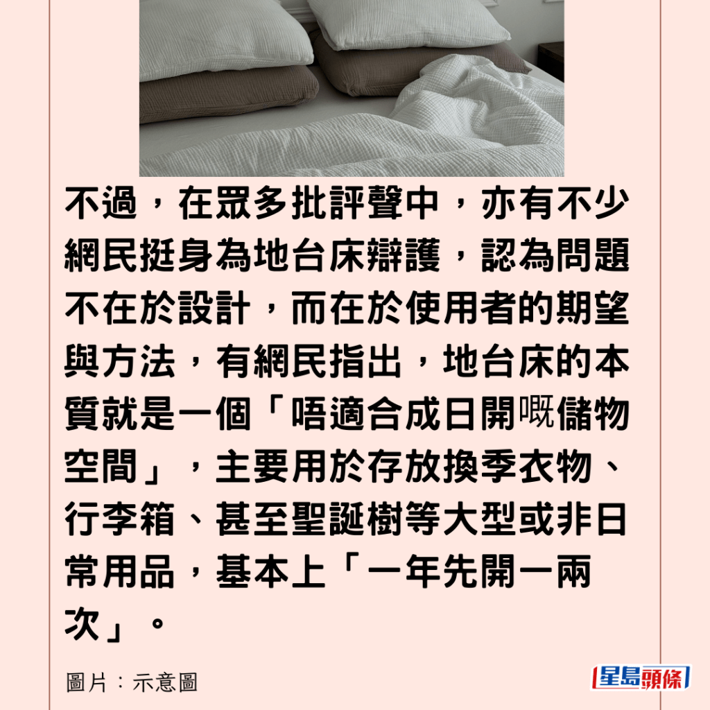 不過,在眾多批評聲中,亦有不少網民挺身為地台床辯護,認為問題不在於設計,而在於使用者的期望與方法,有網民指出,地台床的本質就是一個「唔適合成日開嘅儲物空間」,主要用於存放換季衣物、行李箱、甚至聖誕樹等大型或非日常用品,基本上「一年先開一兩次」。