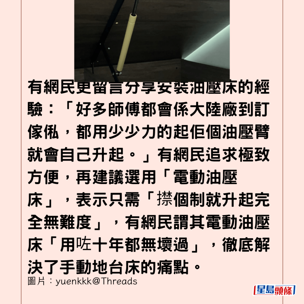 有網民更留言分享安裝油壓床的經驗:「好多師傅都會係大陸廠到訂傢俬,都用少少力的起佢個油壓臂就會自己升起。」有網民追求極致方便,再建議選用「電動油壓床」,表示只需「㩒個制就升起完全無難度」,有網民謂其電動油壓床「用咗十年都無壞過」,徹底解決了手動地台床的痛點。